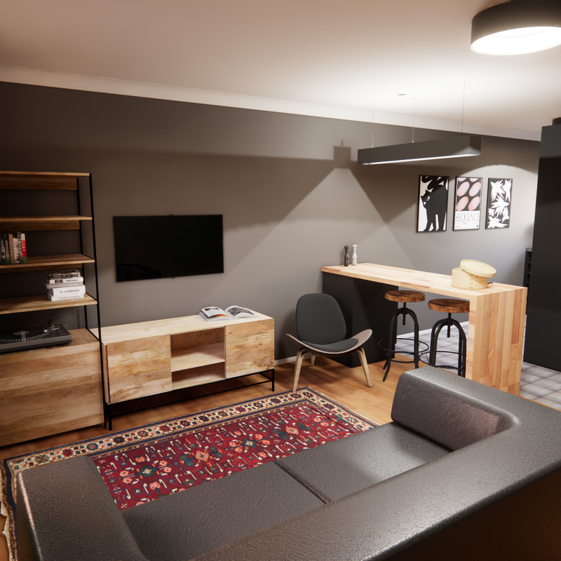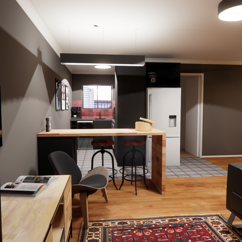 I crafted a striking colour palette centred around deep, moody tones like Dulux Burnished Bark and Hammer Grey, accented with sleek black finishes. Sophistication and functionality were the goals, so to maximize usability, I reimagined the layout to improve counter space significantly, ensuring ample room for both cooking and entertaining. Storage was also a key focus and custom cabinetry was introduced to make the most of every centimetre, including the addition of a spacious new pantry.